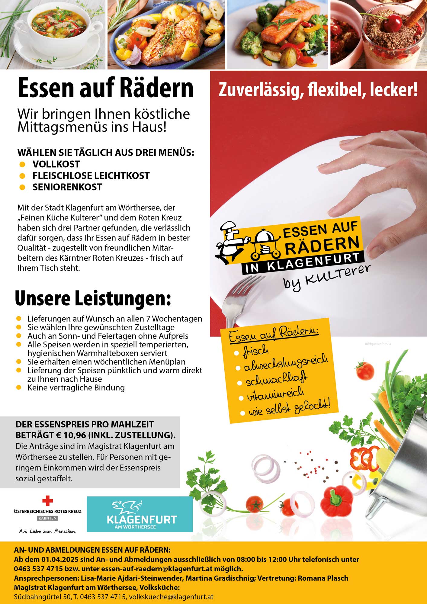 Ab dem 01. April 2025 sind An- und Abmeldungen ausschließlich von 08:00 bis 12:00 Uhr telefonisch unter 0463 537 4715 bzw. unter essen-auf-raedern@klagenfurt.at möglich.